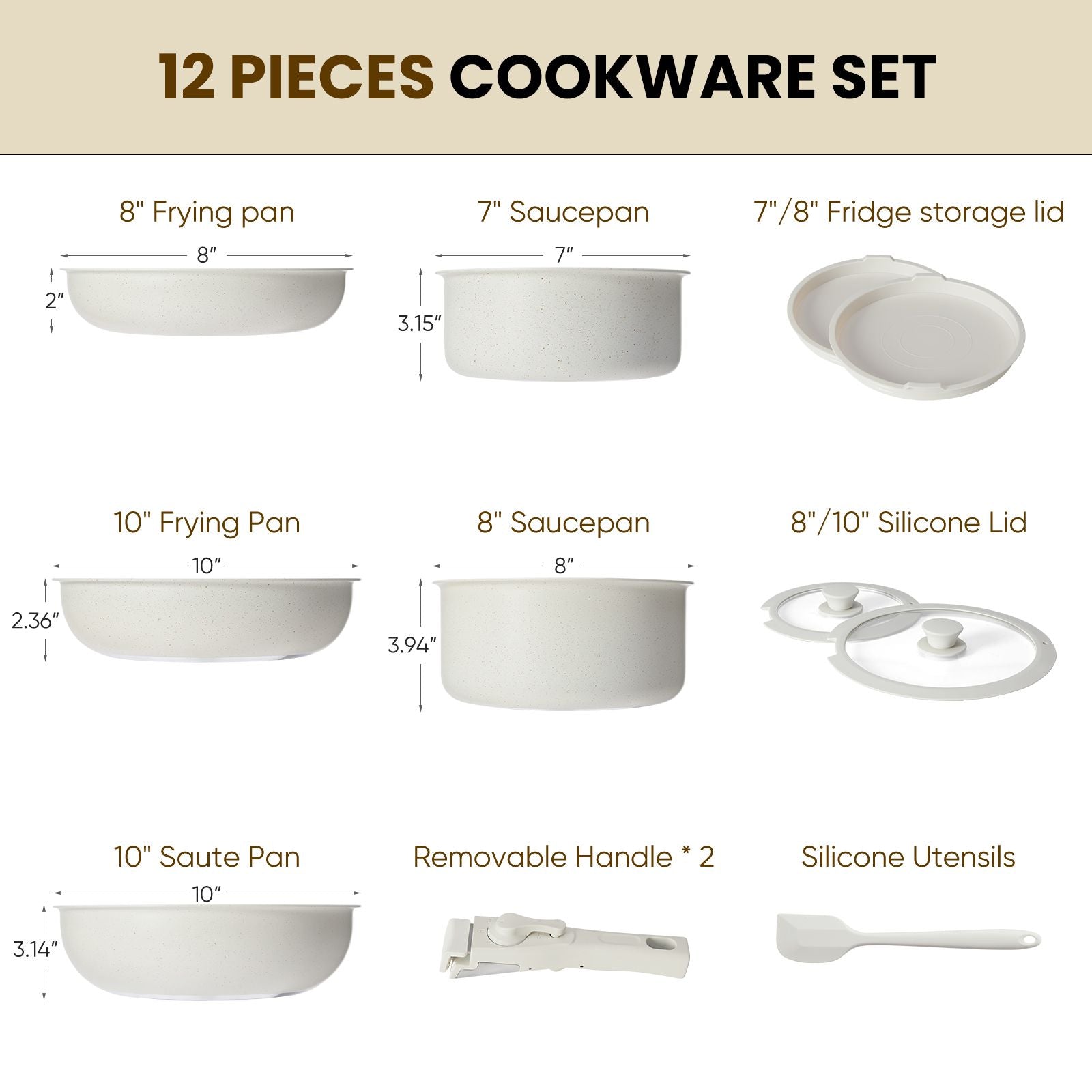 Made with non-stick granite, the cookware set promises easy and effortless cleaning. The unique granite material prevents food from sticking to the surface, reducing the need for oil and making your meals healthier and clean-up faster.This cookware set features detachable handles, perfectly designed to handle hot pots and pans safely. The unique design allows for easy and secure handling while cooking, ensuring you a hassle-free cooking experience.All items in this cookware set are dishwasher-safe and suitable for all types of stovetops. Easy to clean and versatile, it promotes convenience in your day-to-day cooking. Upgrade your kitchen with this premium cookware set, designed for longevity and performance.The granite non-stick coating is safe for use. It is free from potentially harmful chemicals, ensuring your meals won't be contaminated by any unwanted substances. Experience worry-free cooking with our safe and high-quality cookware set.The pots, pans and detachable handles of this cookware set are stackable, saving you valuable kitchen space. Ideal for small kitchens or for those looking to optimize their storage area.